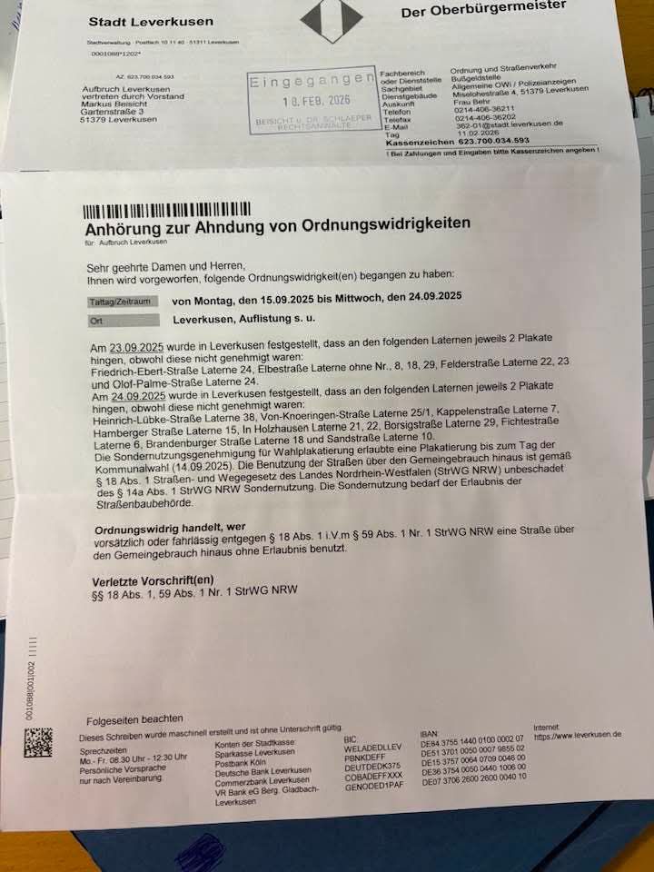 Mittlerweile hat die Stadt Leverkusen mehr als 40 Kostenbescheide und diverse Bußgeldbescheide gegen den Aufbruch Leverkusen erlassen! Obwohl wir im Gegensatz zu vielen unserer Mitbewerber nach den Kommunalwahlen unsere Plakate rechtzeitig abgehängt haben, erhalten wir wöchentlich neue Kostenbescheide. So soll unser Vereinsvorstand ein Bußgeld von 500 Euro begleichen, weil ein Aktivist ein Plakat vor meiner Kanzlei statt um 15.00 Uhr bereits um 14.50 Uhr angebracht hatte.