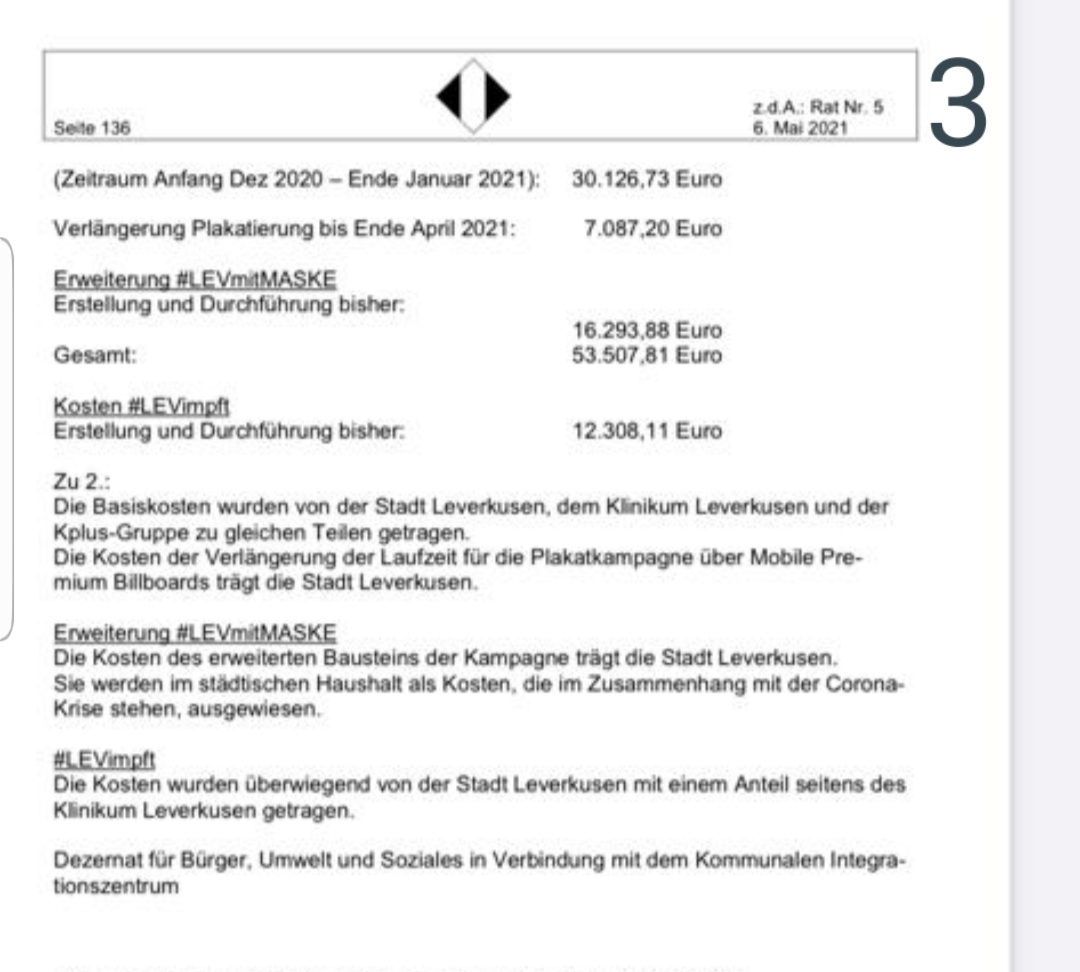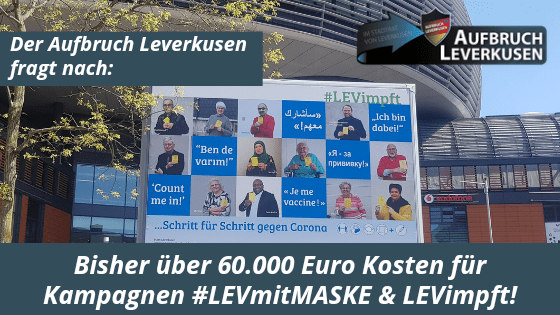Der #AufbruchLeverkusen fragte nach, welche Kosten den Steuerzahler durch diese Kampagne entstehen und wie diese Kosten aufgeteilt werden. Bisher kosteten diese Kampagnen über 60.000 Euro. Ein Ende der Fahnenstange ist noch lange nicht in Sicht, da die Kampagne #LEVimpft noch fortgeführt werden soll. Die bisherigen Ausgaben übernimmt zu Teilen die Stadt Leverkusen, das Klinikum Leverkusen und eine weitere Institution. Letztendlich zahlt der Steuerzahler die Zeche!
