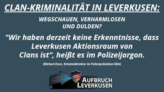 WEGSCHAUEN, VERHARMLOSEN UND DULDEN? So könnte man den Umgang mit kriminellen Clan-Strukturen in Leverkusen bezeichnen. Da wird ernsthaft darüber diskutiert, ob die eine Familie in den Bereich Clan-Kriminalität eingeordnet wird oder ob es sich „nur“ um eine Großfamilie handelt. Wenn ein Kriminaldirektor dann auch noch mitteilt, dass er Leverkusen nicht als Hotspot von Clan-Kriminalität sieht, greift sich der Normalbürger verwundert an den Kopf. Brauchen wir in unserer Stadt erst Verhältnisse wie in einigen Berliner Stadtteilen, damit erkannt wird, dass in Leverkusen sehr wohl ein massives Problem mit kriminellen Clan-Strukturen besteht?