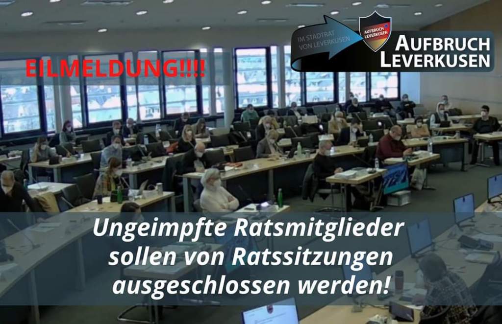 Man kann es kaum glauben! In Leverkusen sollen tatsächlich ungeimpfte, gesunde von den Bürgern in den Stadtrat gewählte Ratsmitglieder zukünftig von der Ratsarbeit ausgeschlossen werden! Vorerst gilt zwar die sogenannte 3-G-Regel, aber diese wird sicherlich nur eine Vorstufe für weitere Verschärfungen sein. Wir erinnern in dieser Hinsicht nur an die neuen Regelungen wenn man ein Fussballspiel von Bayer Leverkusen besuchen möchte, auch dort werden mittlerweile vollkommen gesunde Personen mittlerweile diskriminiert und ausgegrenzt.