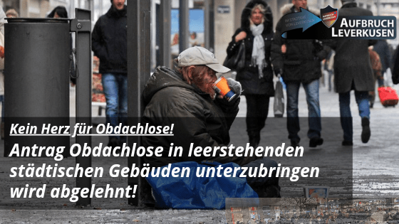 Leider ist das Gegenteil der Fall, die Stadt Leverkusen und die meisten ihrer Ratsmitglieder sehen in dieser Angelegenheit wohl keinen Handlungsbedarf. Ein Antrag des Aufbruch Leverkusen, der die zumindest vorübergehende Unterbringung von Wohnungslosen/Obdachlosen Menschen in leerstehenden städtischen Gebäuden einforderte, wurde am Montag mit großer Mehrheit abgelehnt. Die Altparteien verzichteten sogar auf eine Aussprache zu diesem Thema. Gerade in der kalten Jahreszeit, hätte dringend notwendige Hilfe geleistet werden können. Aber Obdachlose haben bei den Leverkusener Gebrauchtparteien anscheinend keine Lobby.