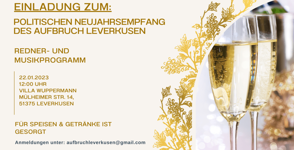 Am Sonntag den 22.01 findet der diesjährige Neujahrsempfang des Aufbruch Leverkusen statt. Wir konnten interessante Referenten aus Politik und Gesellschaft für die Veranstaltung gewinnen.