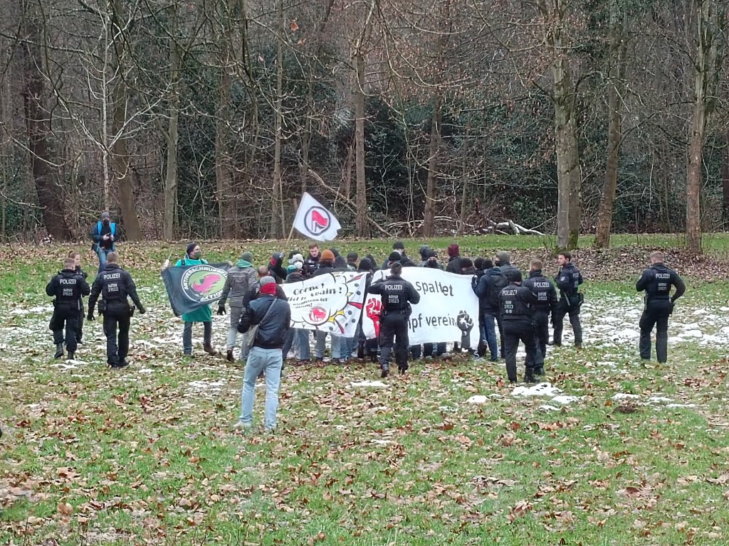 Für reichlich Heiterkeit sorgten ein paar Gegendemonstranten, die zweimal versuchten, die Veranstaltung zu stören, sogar zu stürmen. Dieses Vorhaben wurde aber im Eiltempo durch die anwesende Polizei unterbunden. Man musste sich letztendlich damit begnügen den Zaun des Versammlungsgeländes anzuschreien.