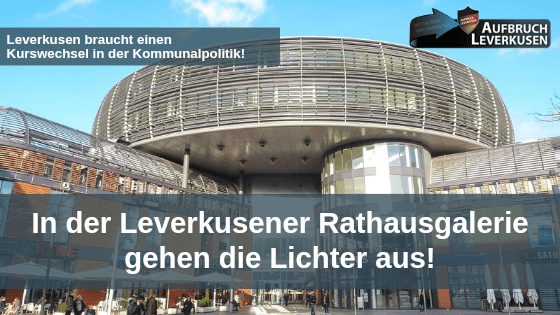 Der Aufbruch Leverkusen fordert dies schon seit geraumer Zeit. Die Altparteien ignorieren leider dreist diese berechtigten Forderungen und lassen die Rathausgalerie langsam sterben. Der gebeutelte Stadtteil Wiesdorf geht immer mehr den Bach herunter und die verbrauchten Altparteien einschließlich Oberbürgermeister Uwe Richrath stehlen sich mal wieder aus der Verantwortung. Es ist Zeit für einen Kurswechsel in der Leverkusener Kommunalpolitik!