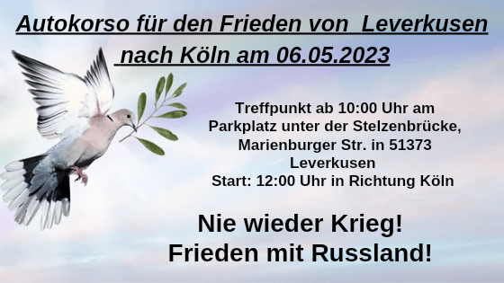 Gemeinsam für den Frieden am 06.05.2023 in Leverkusen Verfasst vonAufbruch Leverkusen16. April 202316. April 2023Veröffentlicht inAllgemein Eine Veranstaltung die wir gerne unterstützen. Das Thema Frieden geht uns alle an. Teilen mit: Klicke, um auf X zu teilen (Wird in neuem Fenster geöffnet) X Mehr Klick, um auf Facebook zu teilen (Wird in neuem Fenster geöffnet) Facebook Gefällt mir Wird geladen … Ähnliche Beiträge