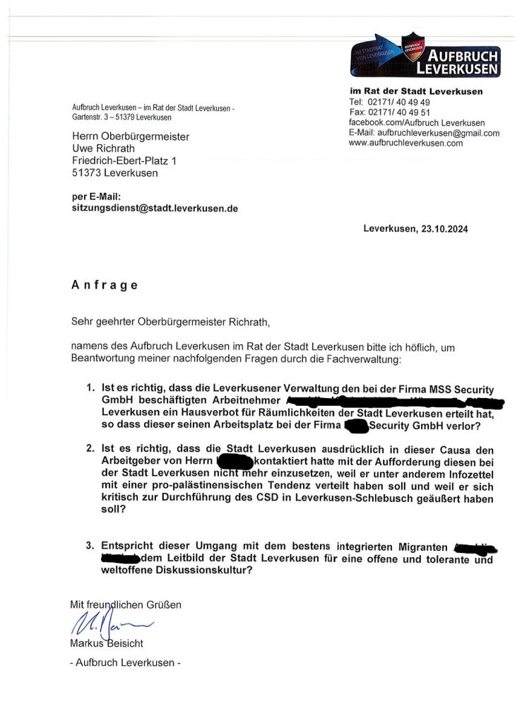 Vor einigen Wochen wurde ein über Jahre hinweg zuverlässiger Mitarbeiter gekündigt, welcher für die Bewachung von städtischen Objekten zuständig war. Die Kündigung des Mitarbeiters erfolgte auf Grund von politischem Druck. Der gekündigte Familienvater hat sich auf Veranstaltungen in Leverkusen für den Frieden im Nahen Osten und für eine normale Familienpolitik eingesetzt. Dieser Umstand war den Leverkusener Blockwarten wohl ein Dorn im Auge.
