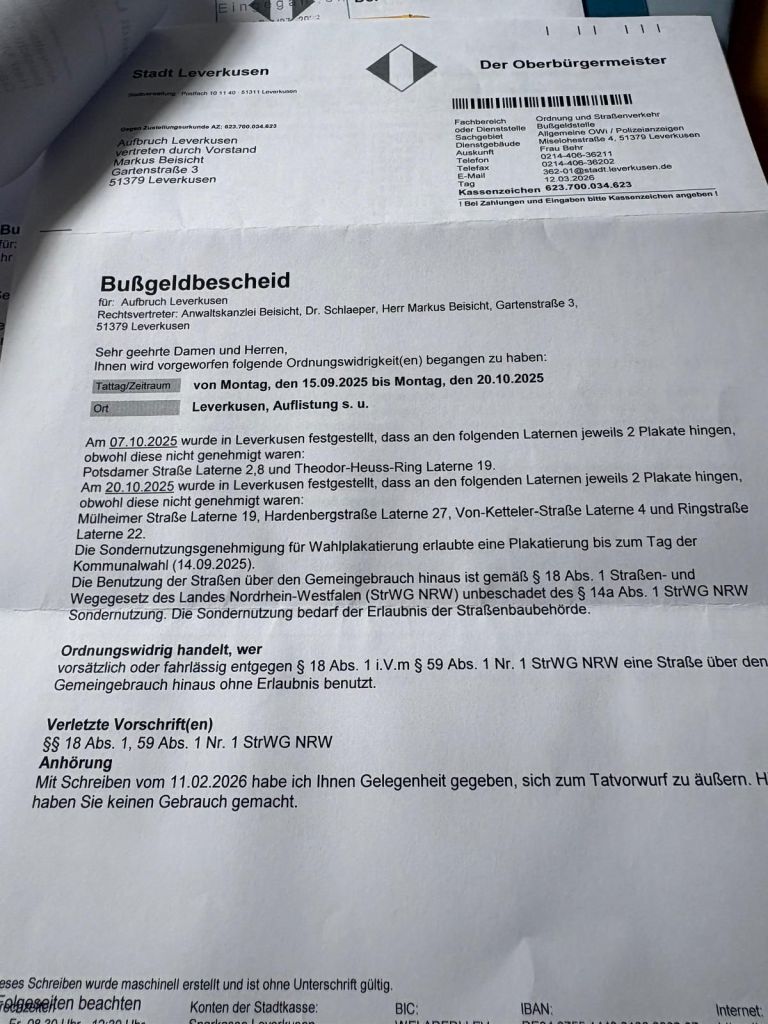 Zunächst erließ die Stadt 51 Kostenbescheide gegen Aufbruch Leverkusen, weil angeblich Plakate nicht rechtzeitig abgehängt worden waren! Über die Rechtmäßigkeit dieser 51 Kostenbescheide muss nun das Kölner VG entscheiden. Zusätzlich verhängt die Ordnungstruppe von OB Hebbel nun tagtäglich neue Bußgeldbescheide gegen den Aufbruch Leverkusen mit der Behauptung der Aufbruch hätte Plakate nicht am Wahlabend sondern erst später abgehängt. Allein in den letzten 2 Tagen sind Bußgeldbescheide über mehr als 2000 Euro bei mir eingegangen.