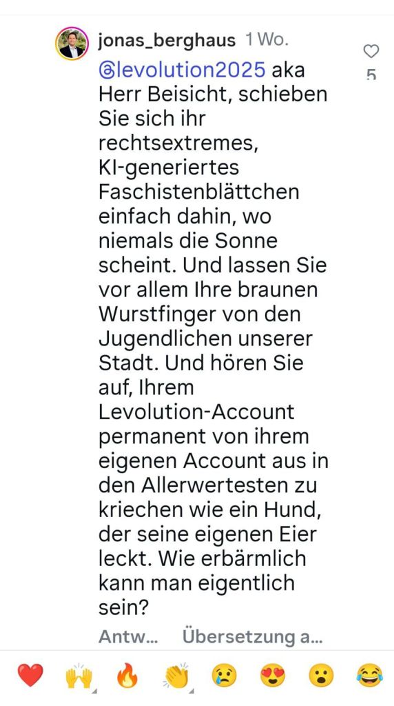 Demokratie lebt von Debatten, die auch kontrovers geführt werden können. Doch wenn aus Diskussionen echte Beleidigungen werden, ist eine Grenze überschritten. Genau das passiert derzeit in Leverkusen: Der SPD-Kommunalpolitiker und Lehrer an einem Leverkusener Gymnasium Jonas Berghaus ist in dem sozialen Netzwerken Instagram mit vulgären Beschimpfungen aufgefallen. Ziel seiner Ausfälle: nicht nur politische Mitbewerber, sondern auch engagierte Jugendliche.