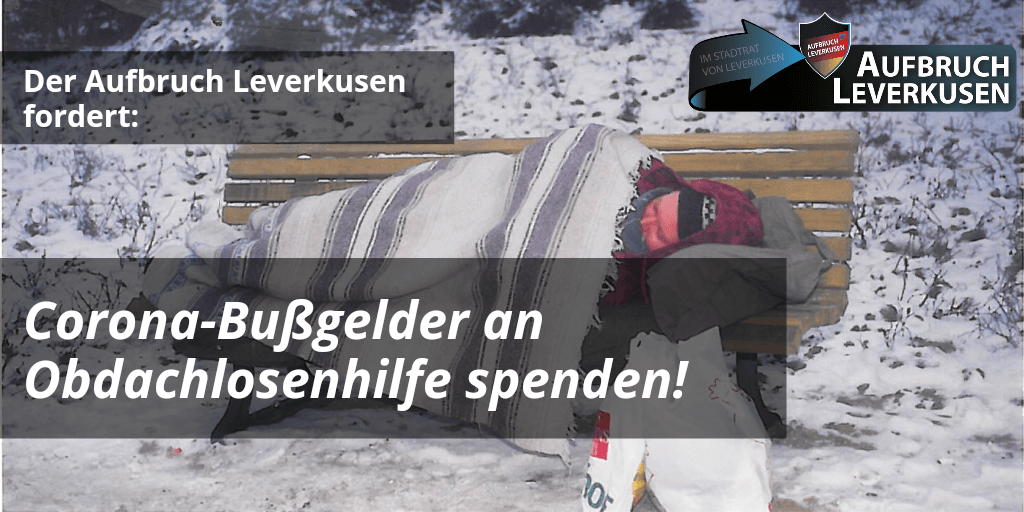 Der Aufbruch Leverkusen beantragte heute, dass Leverkusen dem Vorbild der Stadt Bonn folgend, die Einnahmen aus Corona-Bußgeldern den Einrichtungen der Leverkusener Obdachlosenhilfe zur Verfügung stellt!