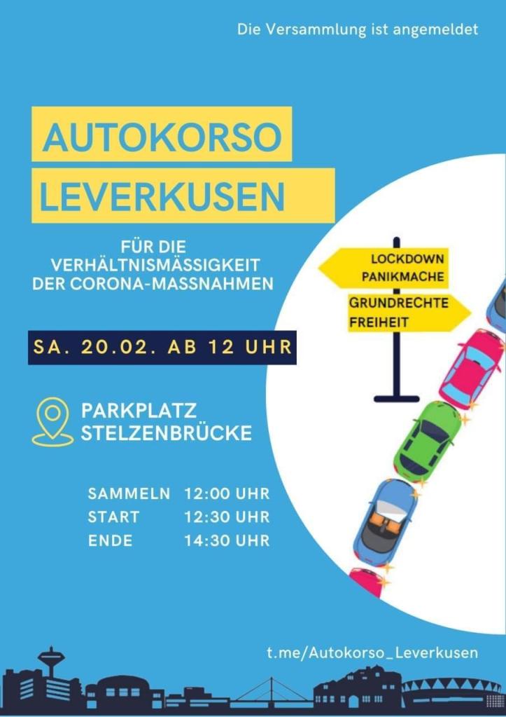 Die Leverkusener Verteidiger der Grundrechte und Kritiker eines unverhältnismäßigen Lockdowns, rufen für Samstag, den 20. Februar 2021 zu einem Autokorso in Leverkusen für die Verhältnismäßigkeit der Corona-Maßnahmen auf.